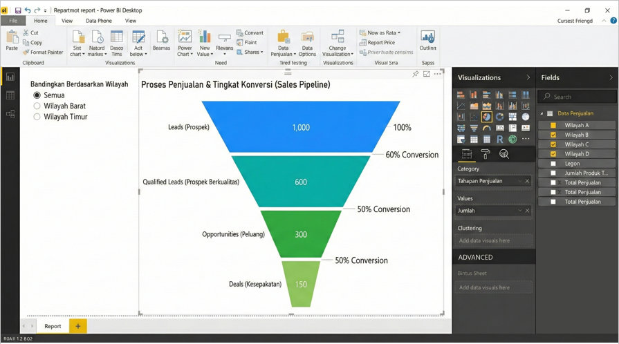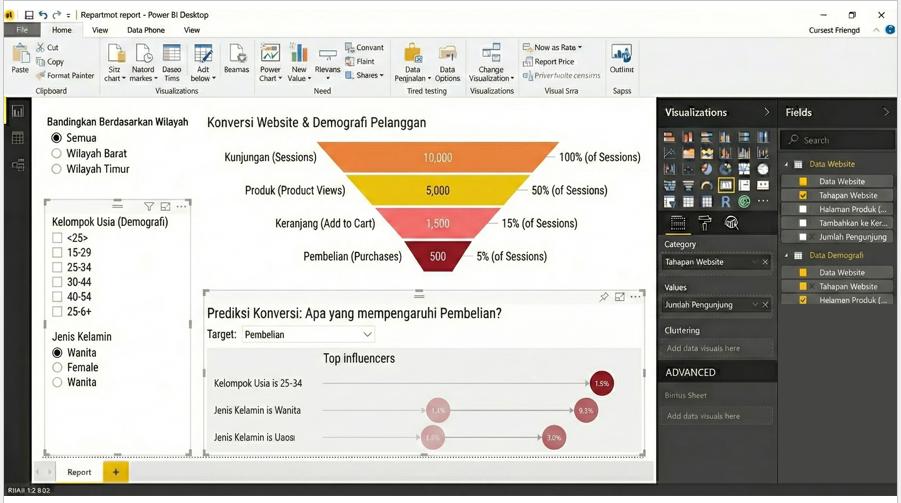 - Aktifkan "Conversion Rate" label di Power BI untuk melihat % penurunan antar tahap secara otomatis.